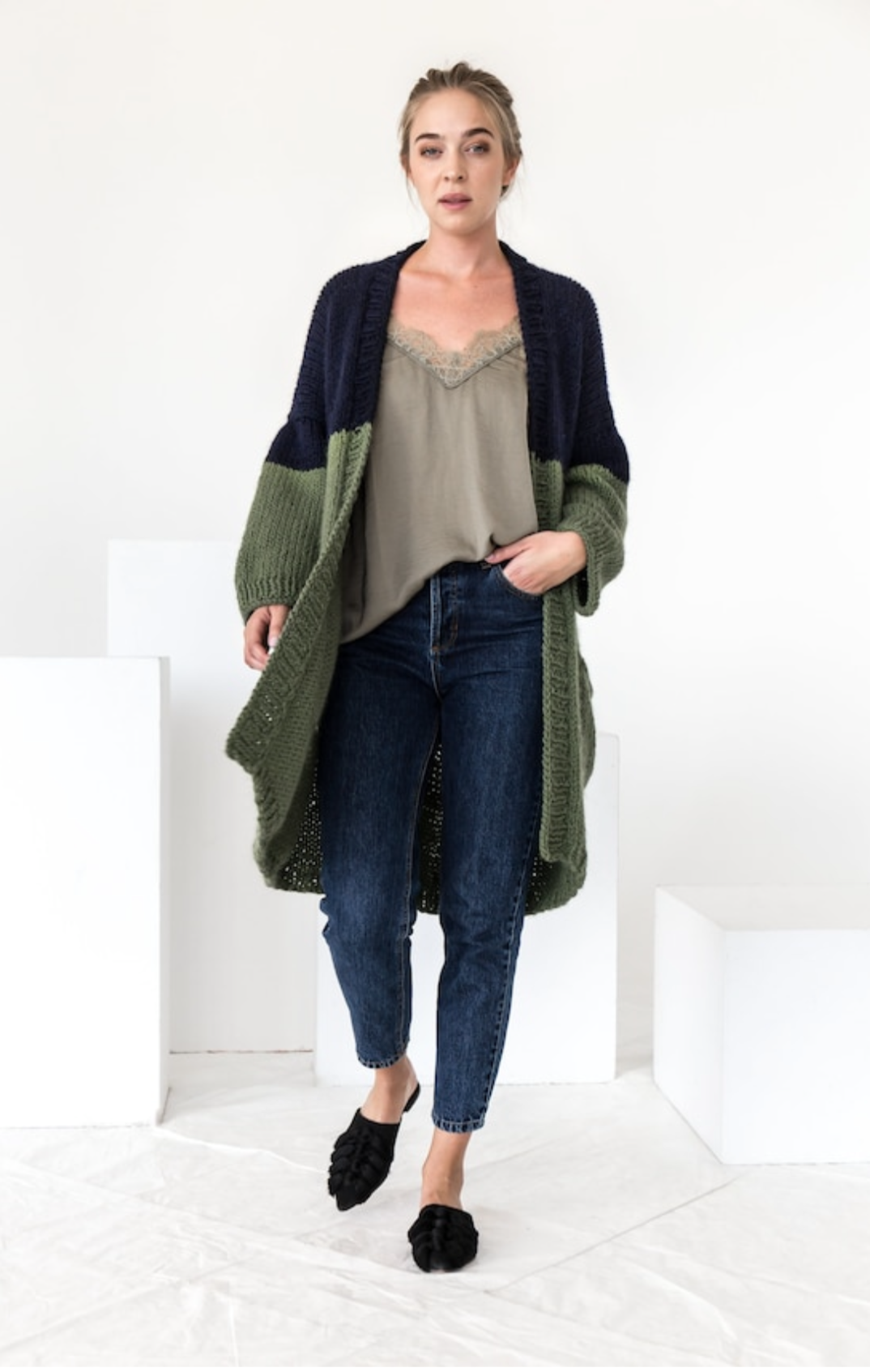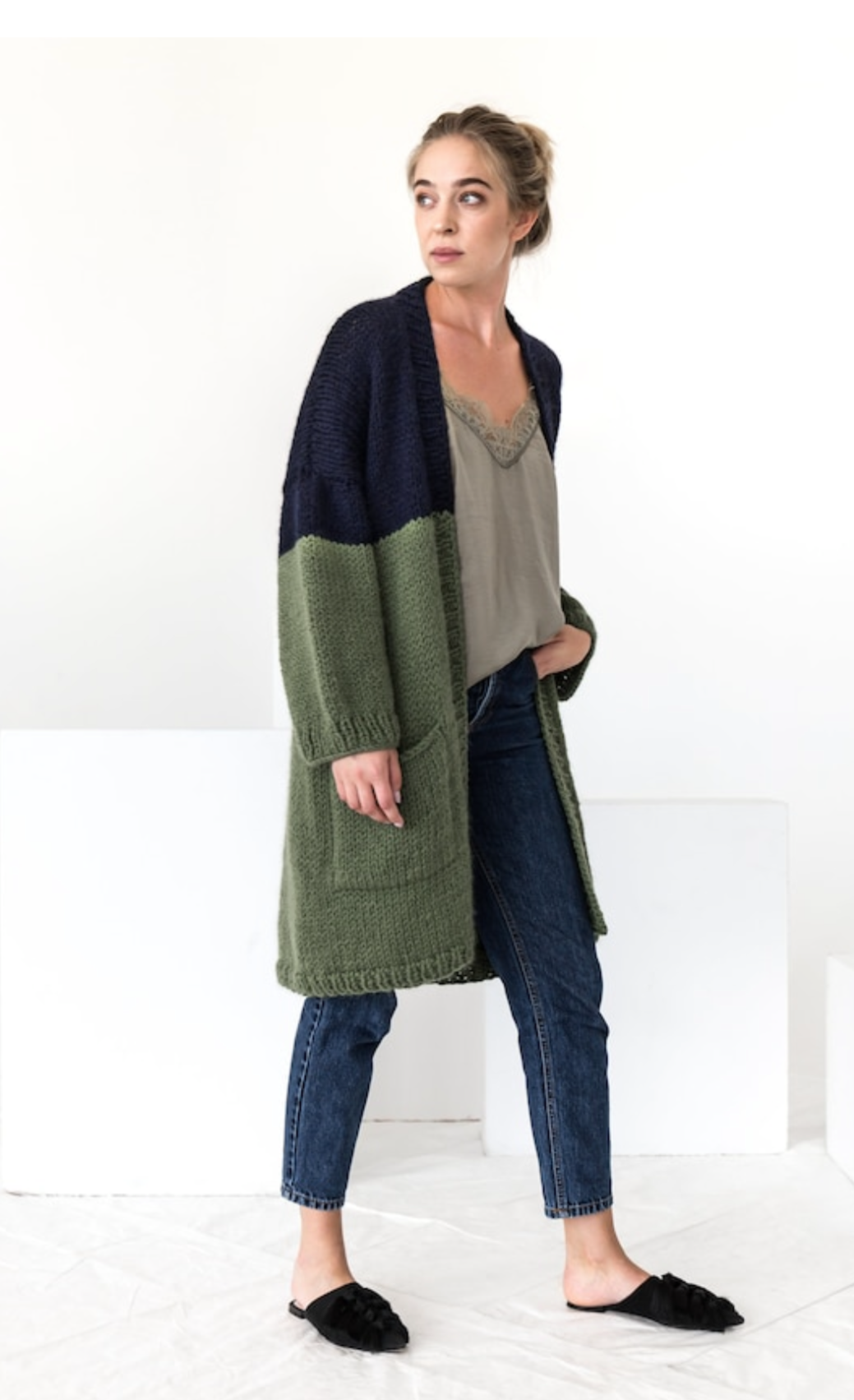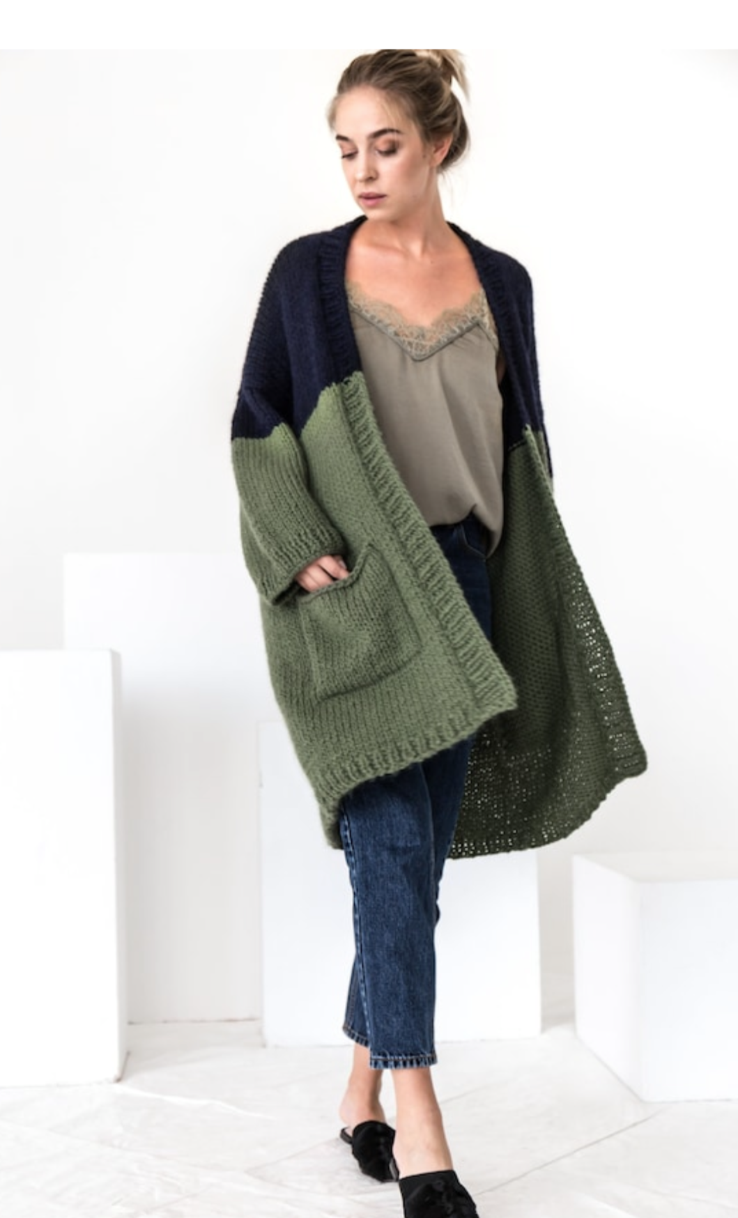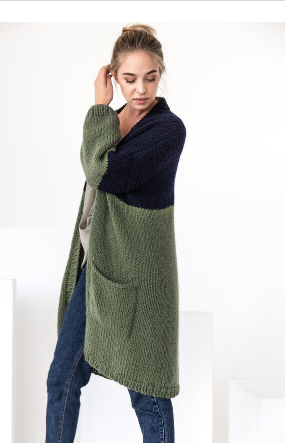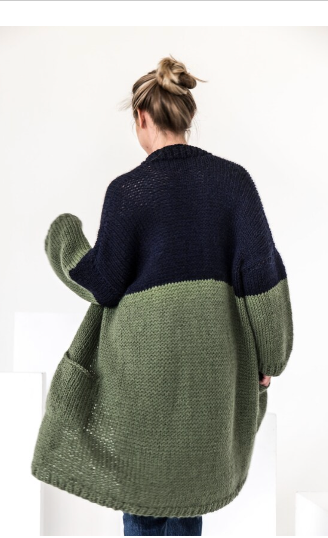 Wrap yourself in warmth with this chunky knit handmade cardigan, crafted from natural wool in a bold navy blue and green color block design. Featuring deep pockets, an open front, and wide sleeves, it's the perfect everyday layer for chilly mornings, evening walks, or cozy porch conversations.