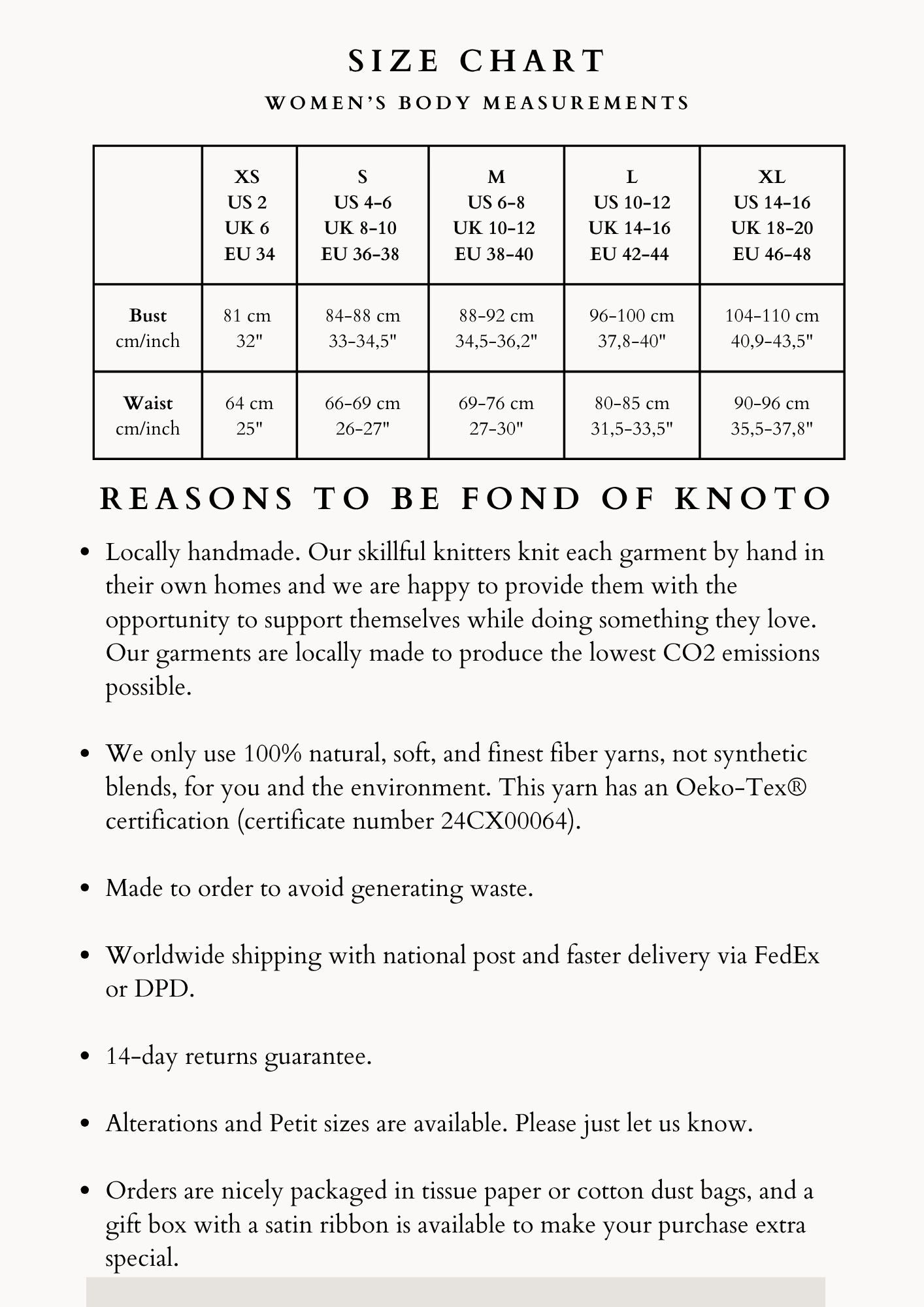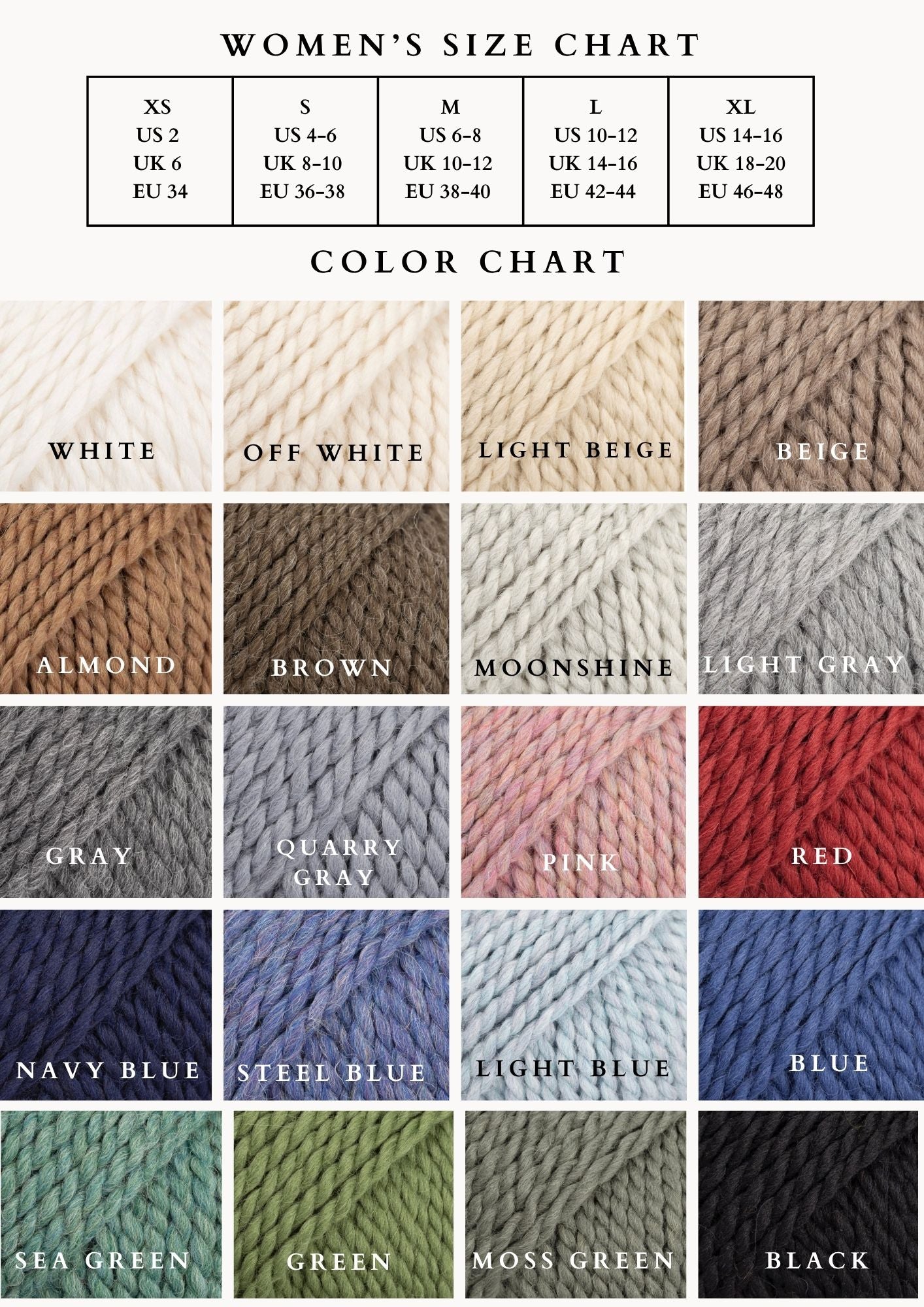 - Be aware that each knit's measurements may vary slightly because of the yarns' nature. Also, as displays and browsers can display colors differently, the shades may not appear exactly as they do.