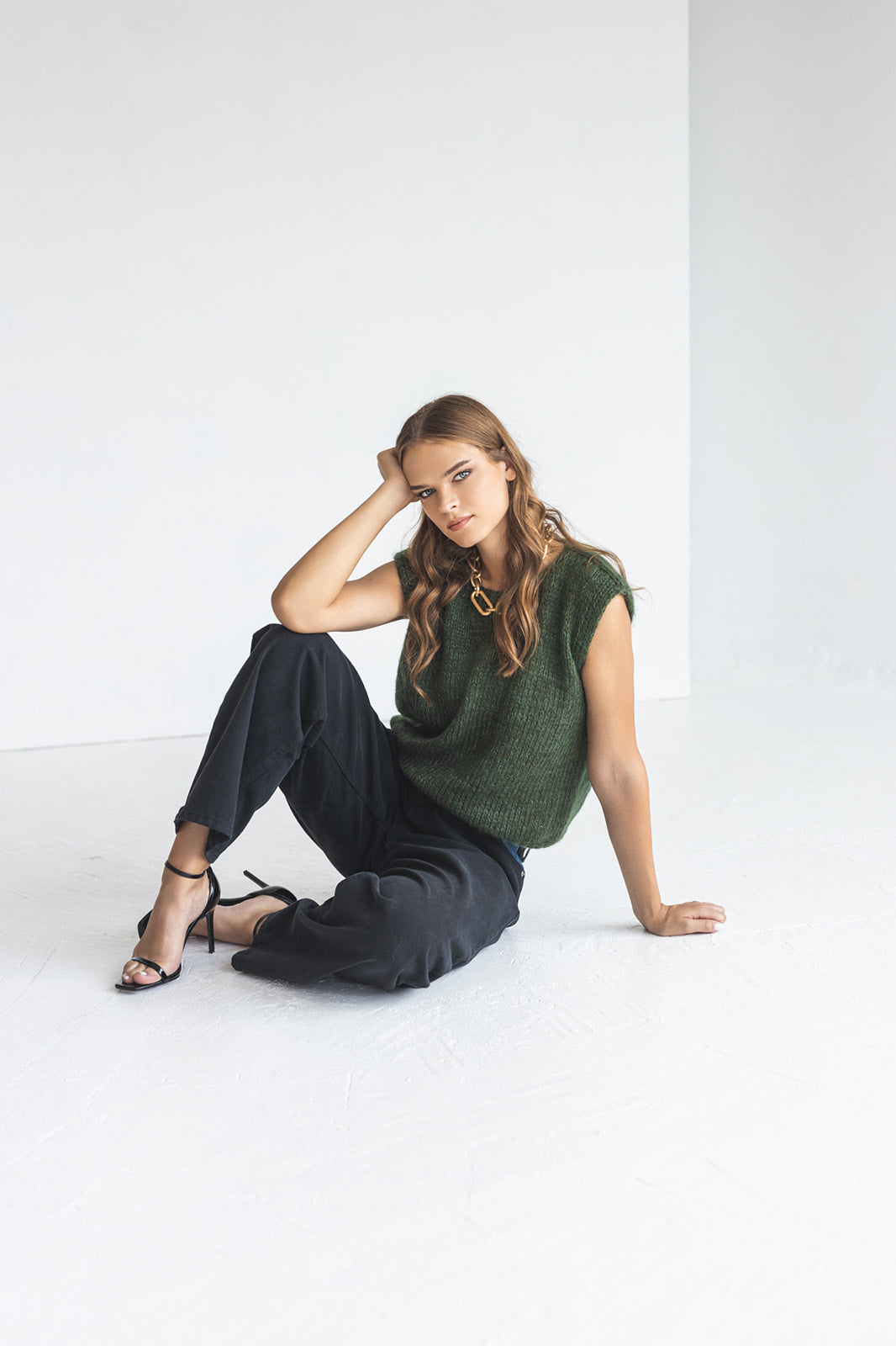 Crafted from a soft blend of alpaca, wool, mohair and silk in dark green color, this vest is designed for a slightly oversized fit. Wear it alone or layered over a shirt.