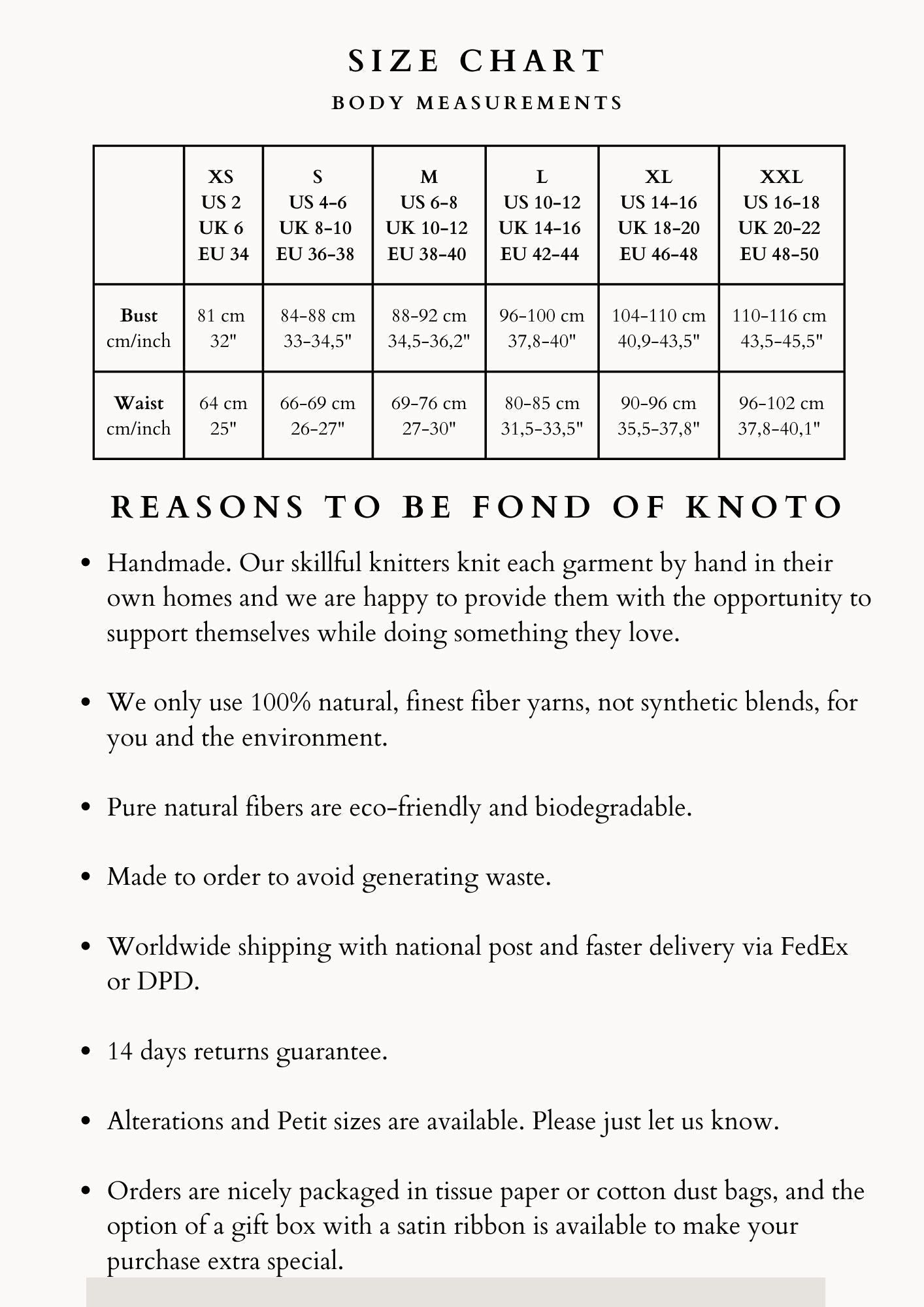 - Please note that all our knits are handmade in the homes of our skilled artists. Every item is knit, sewed, and washed by hands. Some colors and sizes are made to order, that is why it can take up to 9 business days for your new cardigan to be shipped.