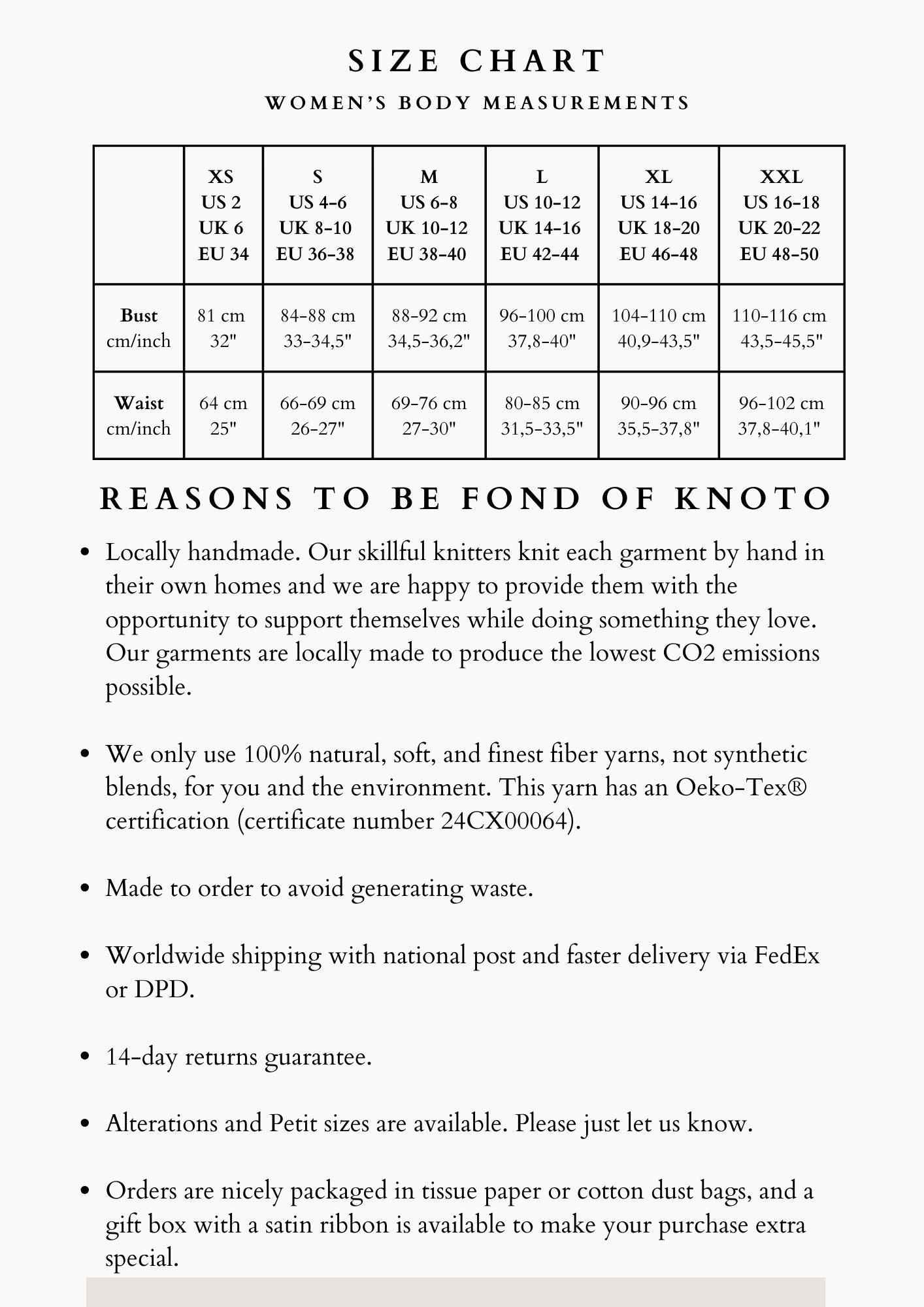 - Be aware that each knit's measurements may vary slightly because of the yarns' nature. Also, as displays and browsers can display colors differently, the shades may not appear exactly as they do.