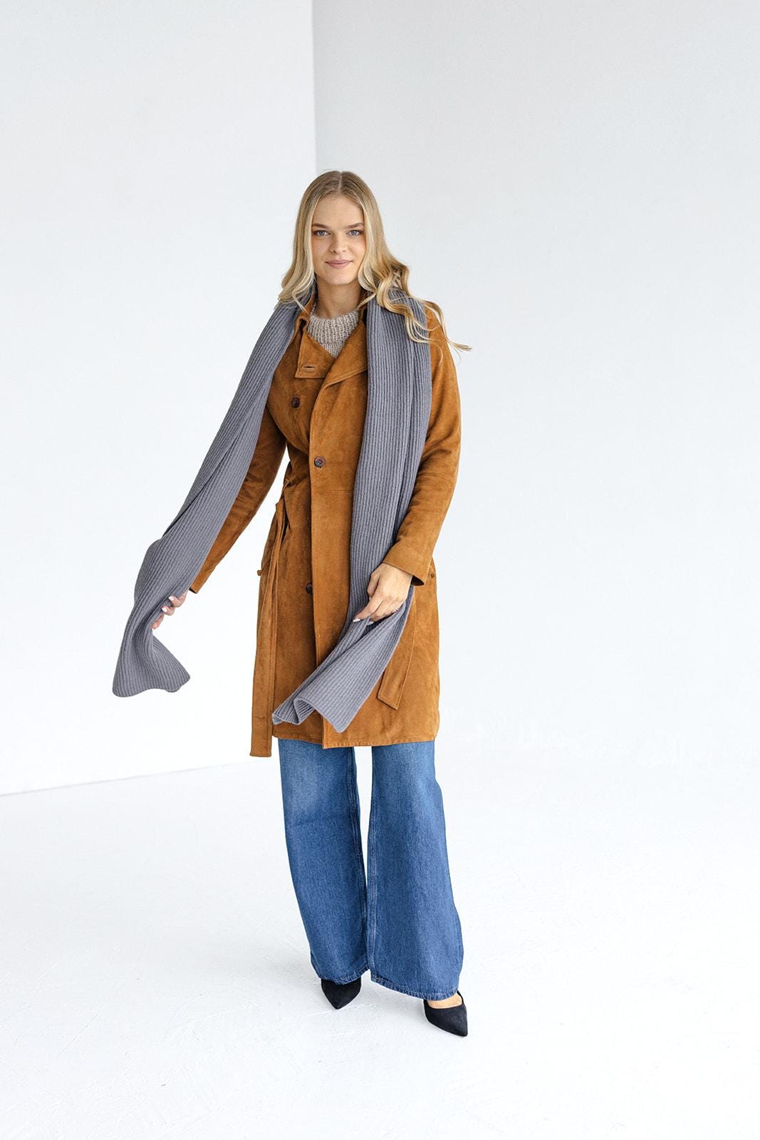 This gray knitted scarf, made from a luxurious blend of merino wool and cashmere, offers both warmth and elegance. The cashmere softness adds a touch of indulgence, making it a pleasure to wear. Whether draped over the shoulders or wrapped snugly around the neck, this timeless piece is a must-have for your cold-weather wardrobe.