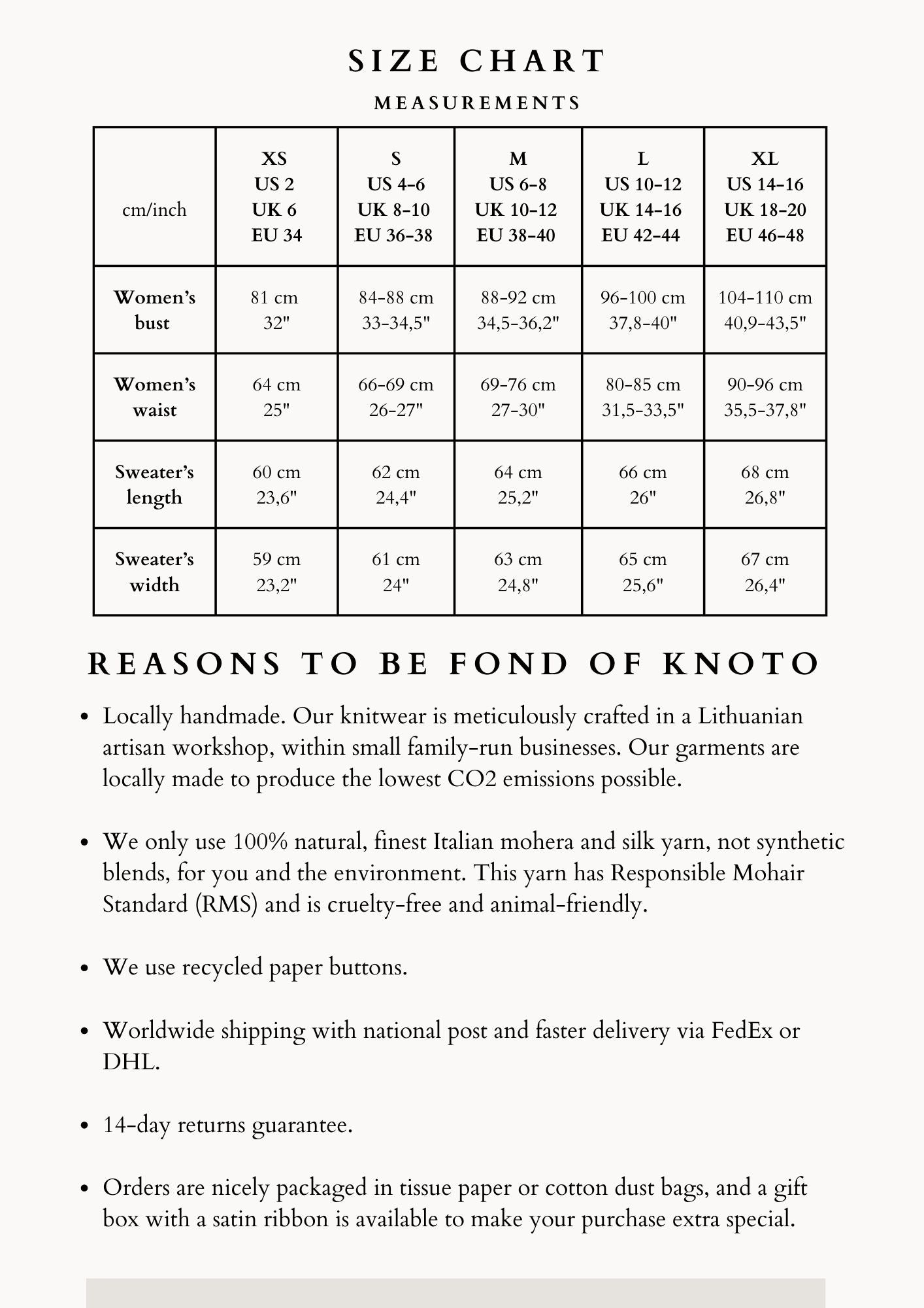 - Each knit's measurements may vary slightly because of the nature of the yarns. Also, as displays and browsers can display colors differently, the shades may not appear exactly as they do.