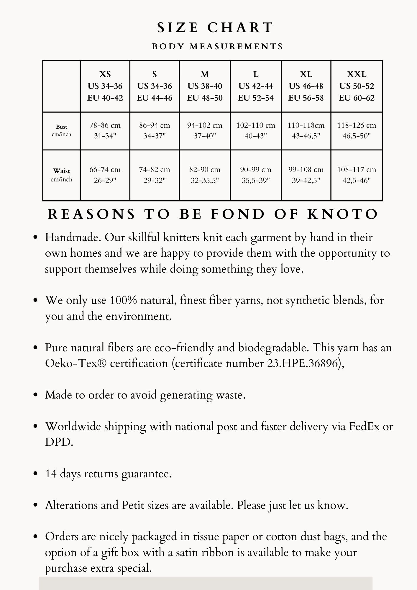 - Composition: alpaca wool and silk. No synthetic blends, for you and the environment.
